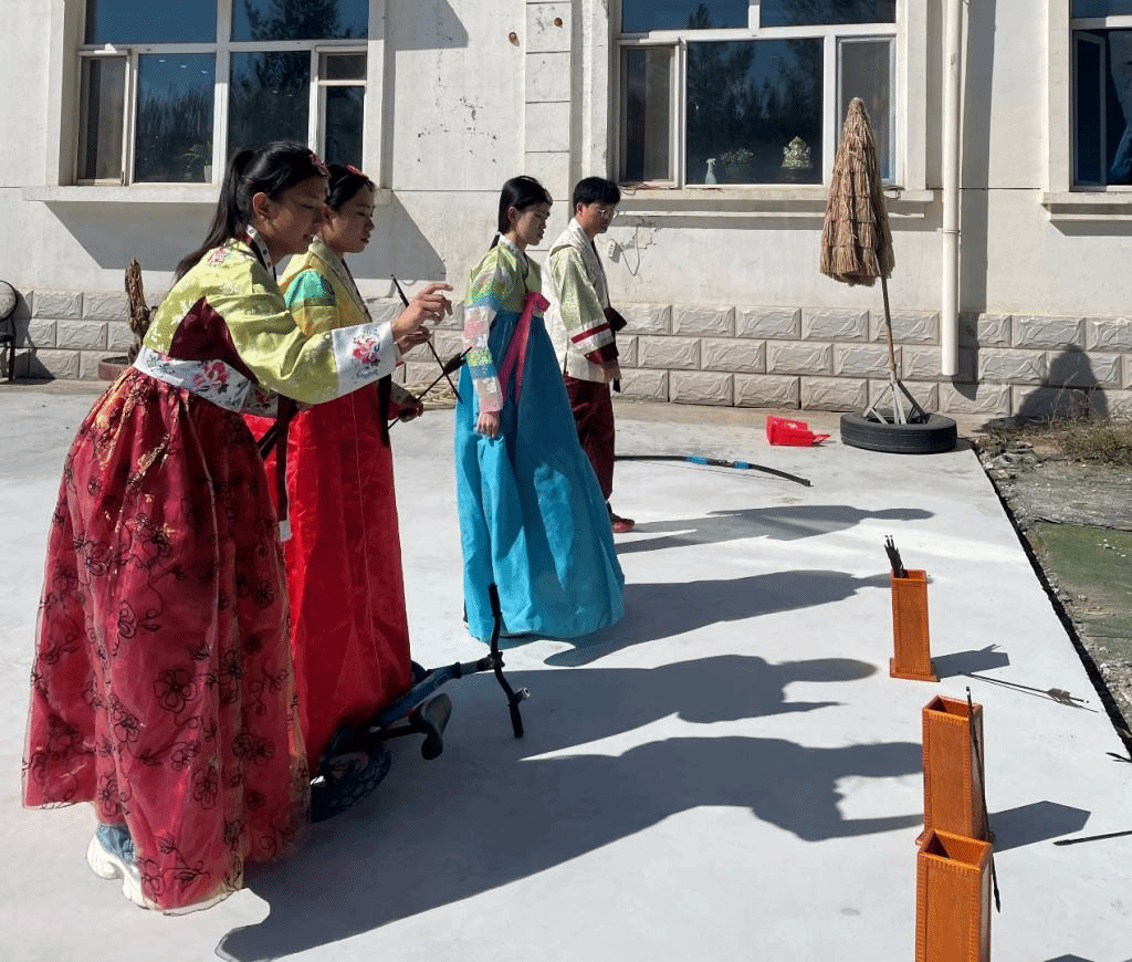活动一开始,学生们便换上了华丽精致的韩服,仿佛穿越时空,沉浸在了韩国传统文化的浓厚氛围中。紧接着,活动进入了游戏环节,学生们兴致勃勃地参与了韩国传统的投壶游戏和尤茨游戏。这两项游戏不仅考验了他们的技巧与智慧,更让他们在游戏中充分运用了韩语词汇和表达方式。
