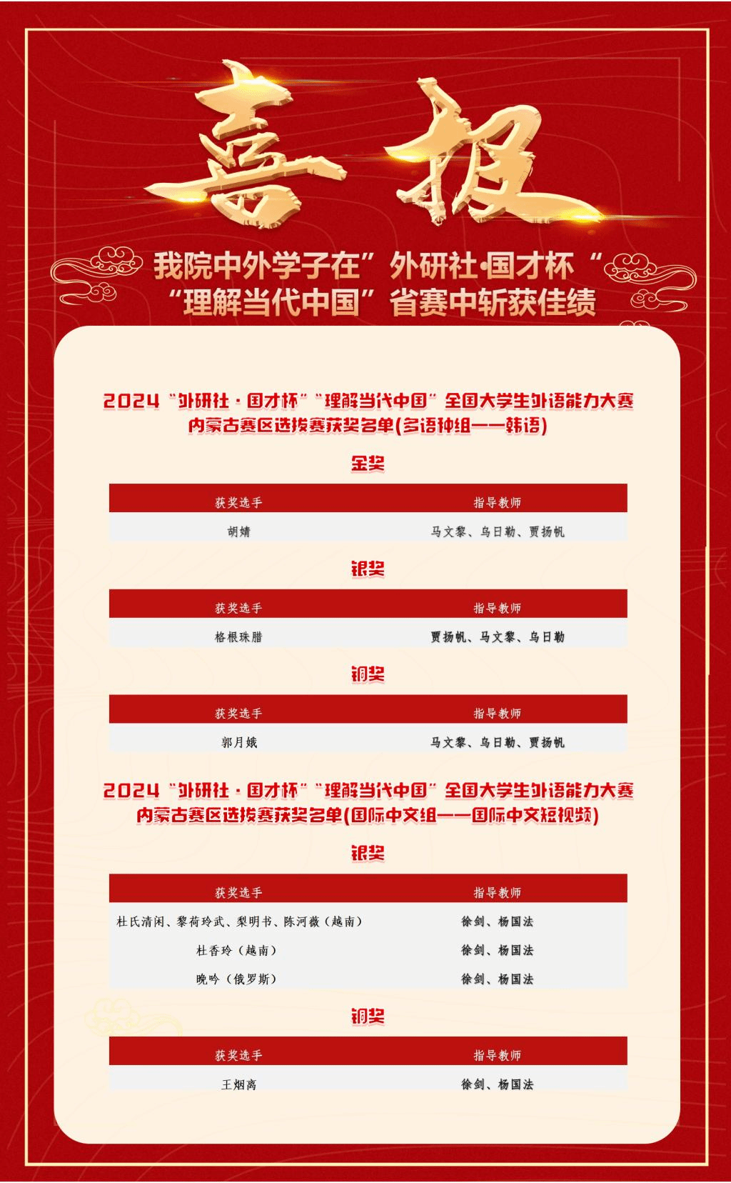 近日,“外研社 国才杯”“理解当代中国”全国大学生外语能力大赛内蒙古赛区选拔赛圆满落幕,太阳集团官网朝鲜语专业学生及来华留学生分别在多语种赛道、国际中文短视频赛道上大放异彩,共斩获一金、四银、两铜,其中朝鲜语专业胡婧同学进入了国赛,为我校赢得了赞誉。